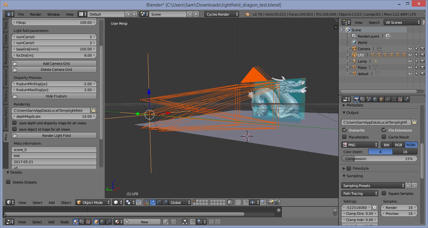 Instead of attempting to explain the theory behind light fields (for which there are plenty of excellent online sources), the main focus of this post is to show how to quickly get started with rendering a synthetic light field using Blender Cycles and some open-source plug-ins. If you're interested in a crash course on light fields, check out Joan Charmant's video tutorial below, which explains the basics of implementing a light field renderer: