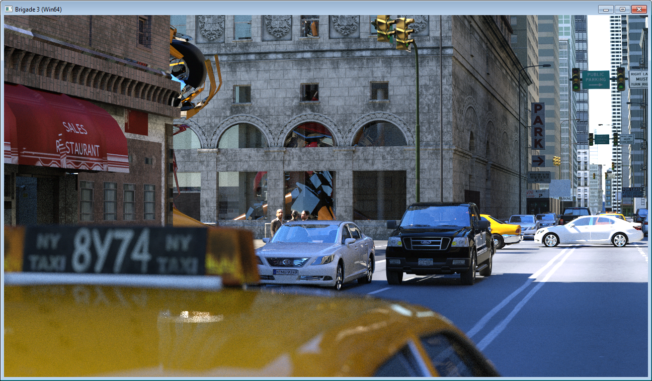 Right now, Brigade can do the exact same thing as what you see in the animation sans the smoke and motion blur. That animation actually inspired me to try the NYC scene you see in this post (and which was featured in my first blogpost in 2008) in Brigade and I must say that the results greatly exceeded my expectations.