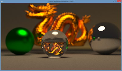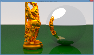 The next tutorial will add even more speed: I'll dive deeper into the highly optimised BVH acceleration structure for GPU traversal from Aila and Laine, which uses spatial splitting to build higher quality (and faster) trees. It's also the framework that the GPU part of Blender Cycles is using.